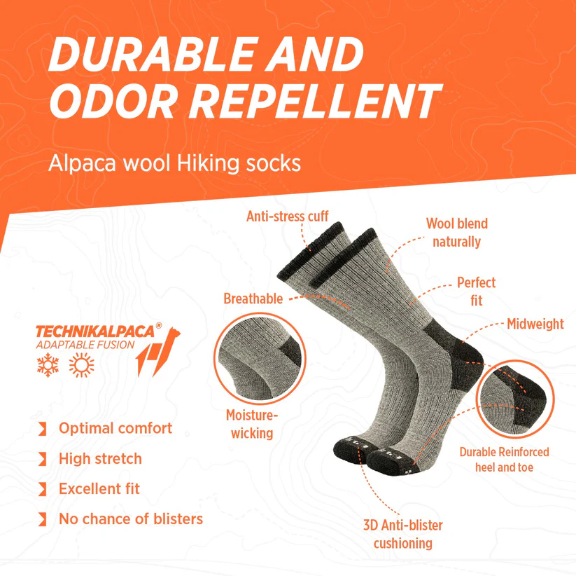 Los calcetines Technikalpaca están fabricados con una mezcla técnica de fibra de alpaca, lana merino y bambú, que garantiza comodidad, transpirabilidad y resistencia en todo tipo de climas. Su diseño termorregulador mantiene los pies cálidos en el frío y frescos en el calor, mientras que la acción capilar de la fibra ayuda a eliminar la humedad y prevenir malos olores.