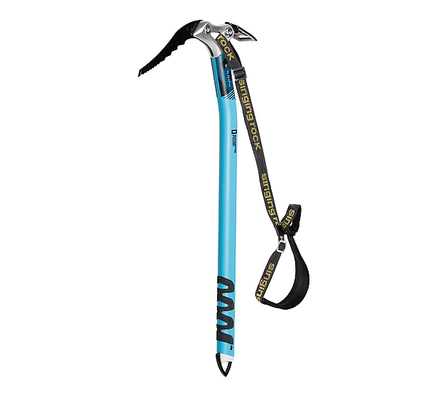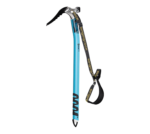 El pico es lo suficientemente agresivo para hielo duro y escalada mixta ligera, e incorpora una zona de agarre suave que protege los guantes al sujetar la cabeza. Su forma está diseñada para atascarse en fisuras y brindar apoyo en nieve blanda. El orificio de la cabeza es compatible con cualquier mosquetón.